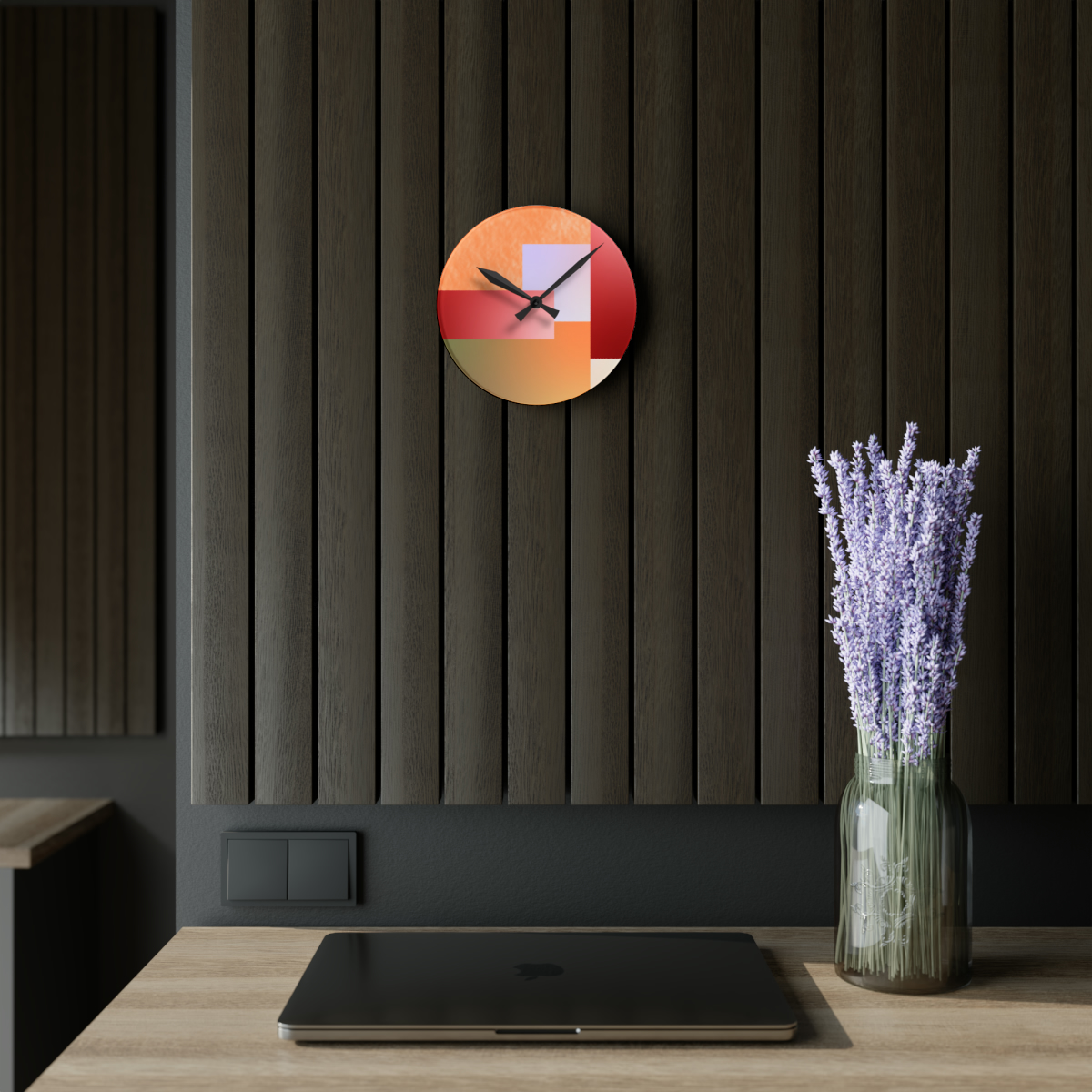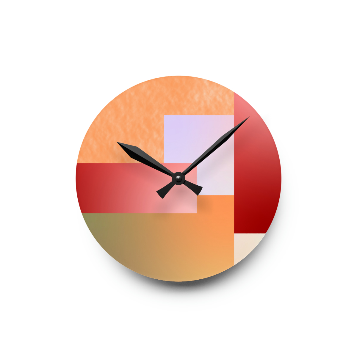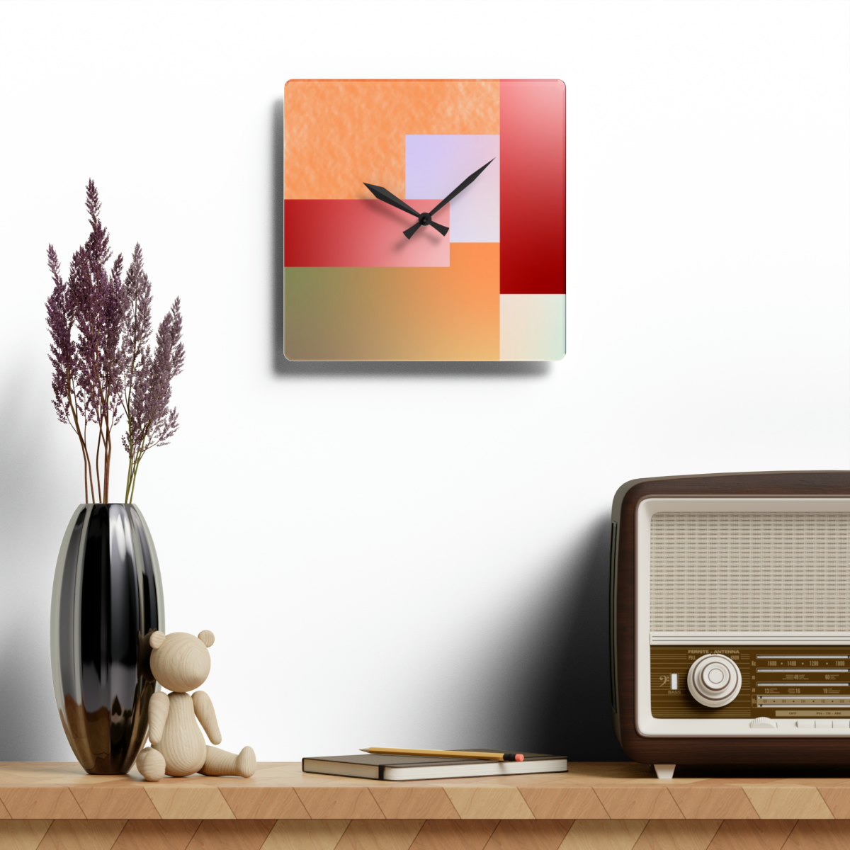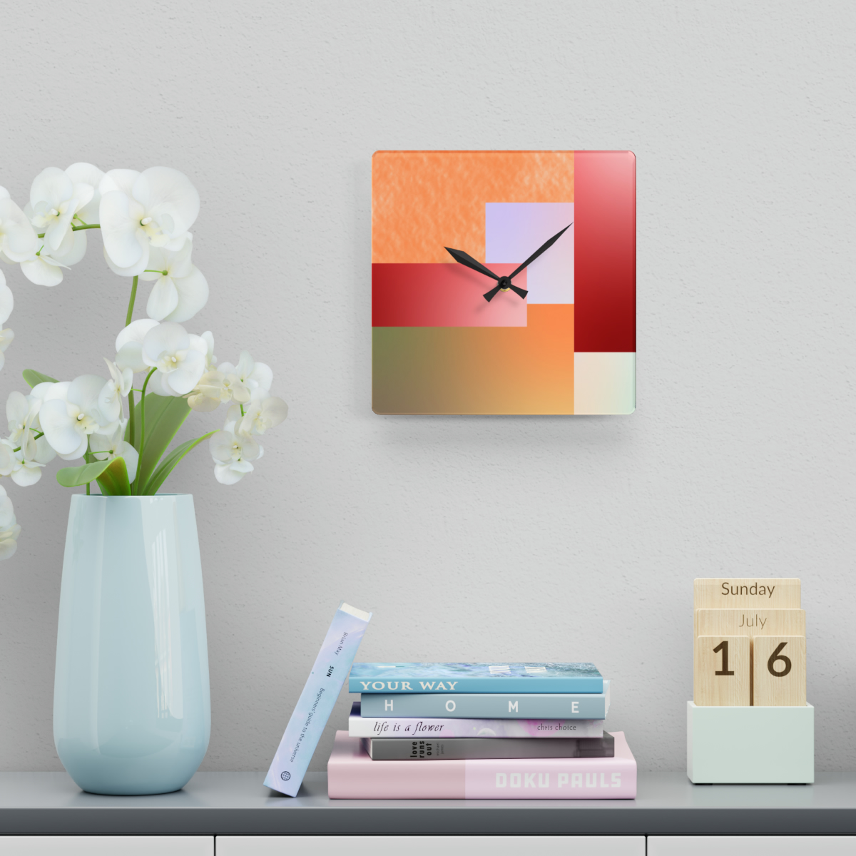 These clocks come in two shapes (round and square) and two sizes. Each clock has a keyhole at the back for easy hanging on a wall. They’re made from an acrylic material that looks like glass but is more durable and sturdy.